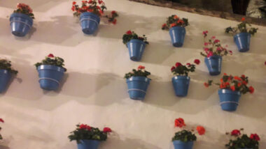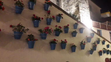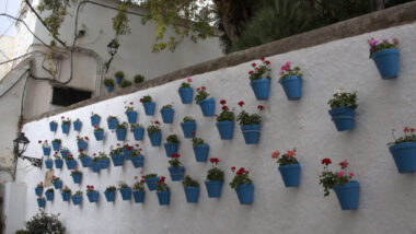 Die traditionell weißen Wände eines spanischen Dorfes sind mit hübschen Pflanzen in blauen Töpfen geschmückt.