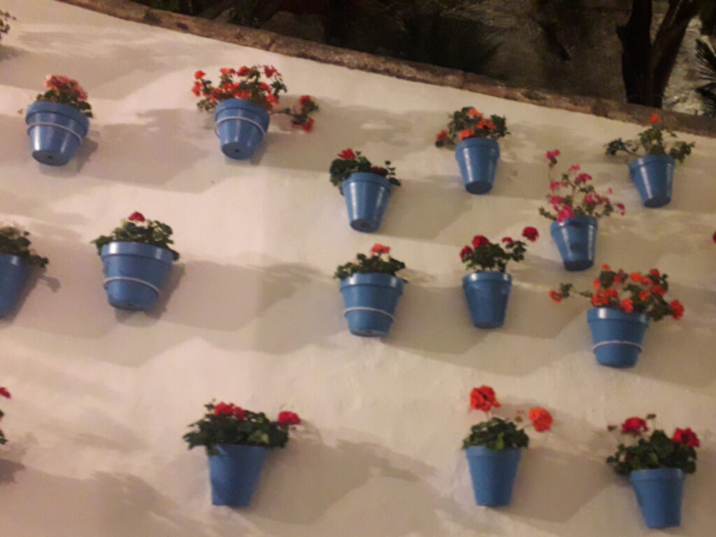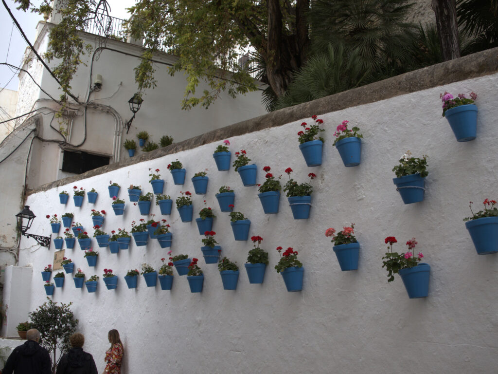 Die traditionell weißen Wände eines spanischen Dorfes sind mit hübschen Pflanzen in blauen Töpfen geschmückt.