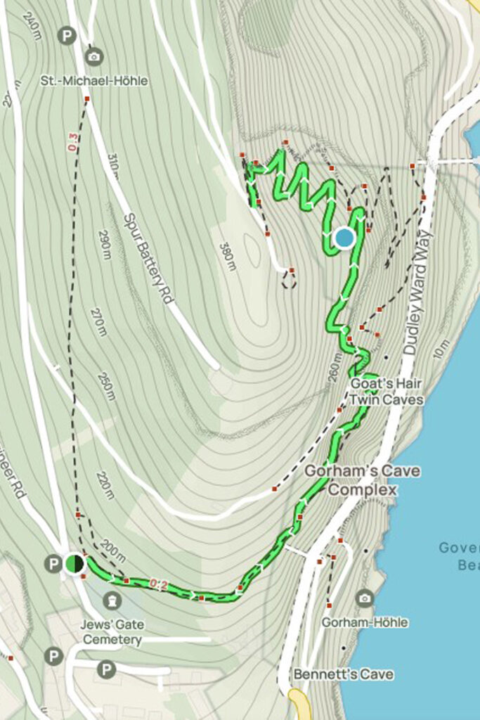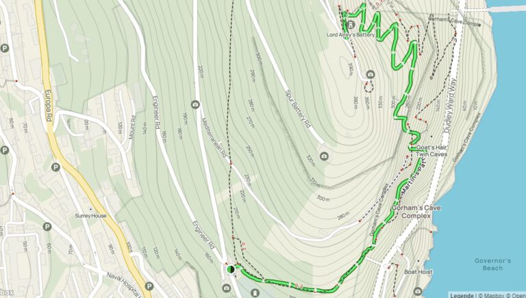 Die Wanderung beginnt am Martin’s Path, einem wunderschönen Weg, der Sie zur Batterie von Lord Airey in der Nähe des Gipfels des Felsens von Gibraltar führt. Der Weg ist steil und steinig , aber die atemberaubende Aussicht von oben wird dich belohnen.