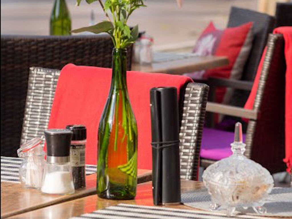 Die Außenterrasse lässt sich bei Wind oder in der kalten Jahreszeit flexibel abtrennen und zum Wärmen liegen an den Tischen Decken bereit.