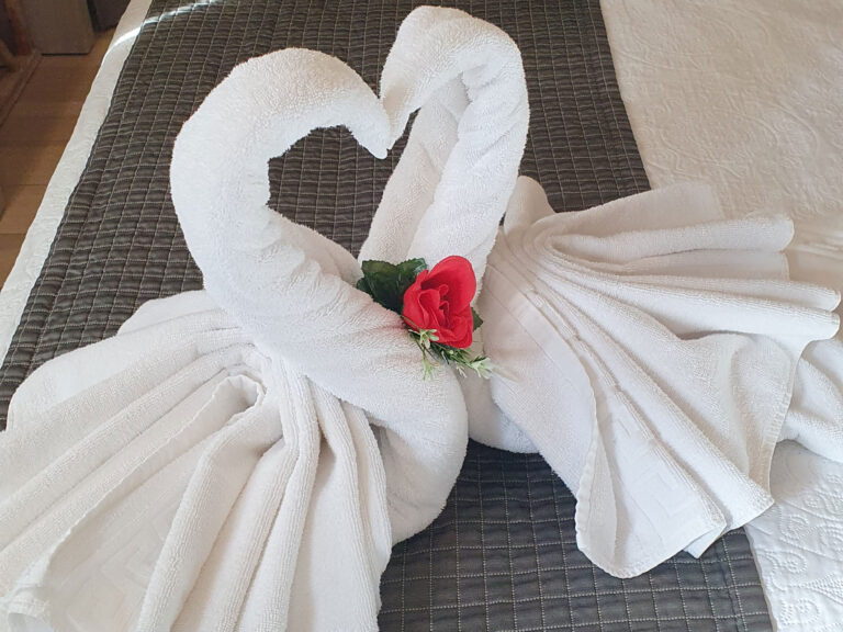 Besonders von den dekorativ angerichteten Schwänen aus Handtüchern und der Rose im Glas war ich begeistert. So wurde ich noch nicht einmal von mittelklassigen Hotels in Deutschland begrüßt.