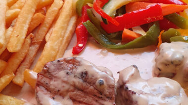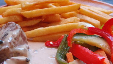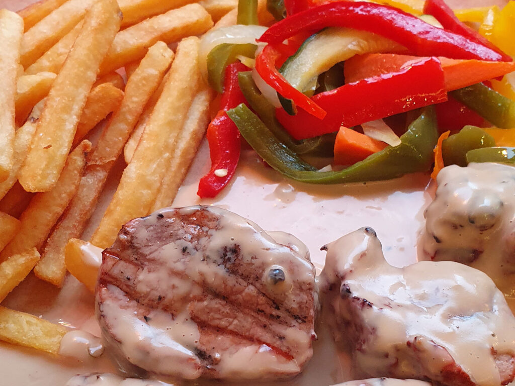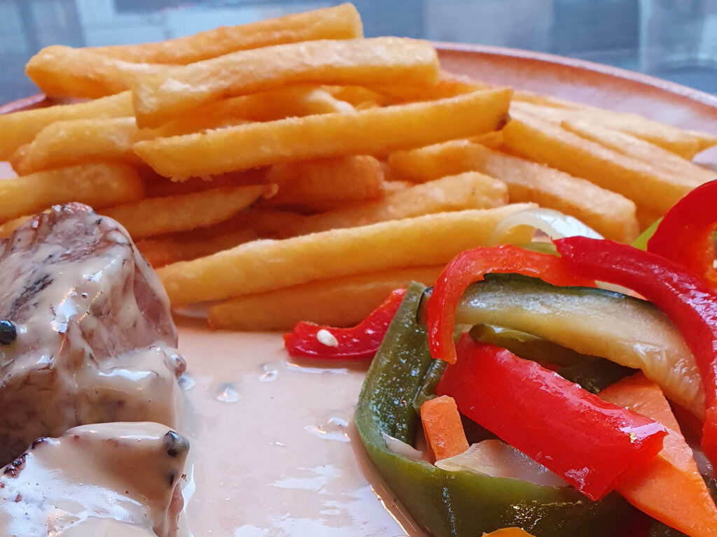 Zu meinem Bier bestellte ich mir Steakmedaillons mit Pommes und Gemüse.