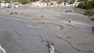 Der Strand vermittelt dem Besucher, dass er zum dahinter liegenden Hotel Balcón de Europa gehört, ist aber tatsächlich öffentlich. Restaurant und Terrassenbereich des Hotels gehen nahtlos in den Strand über.