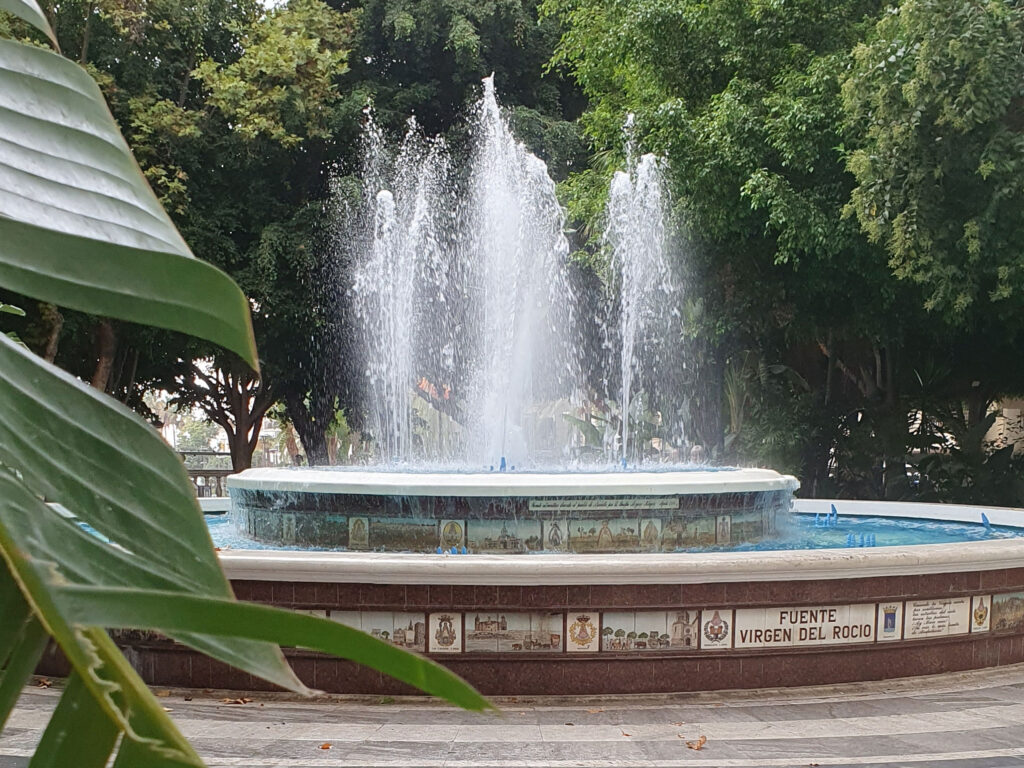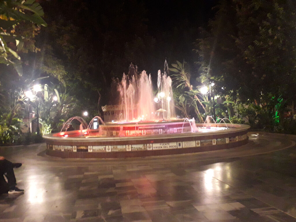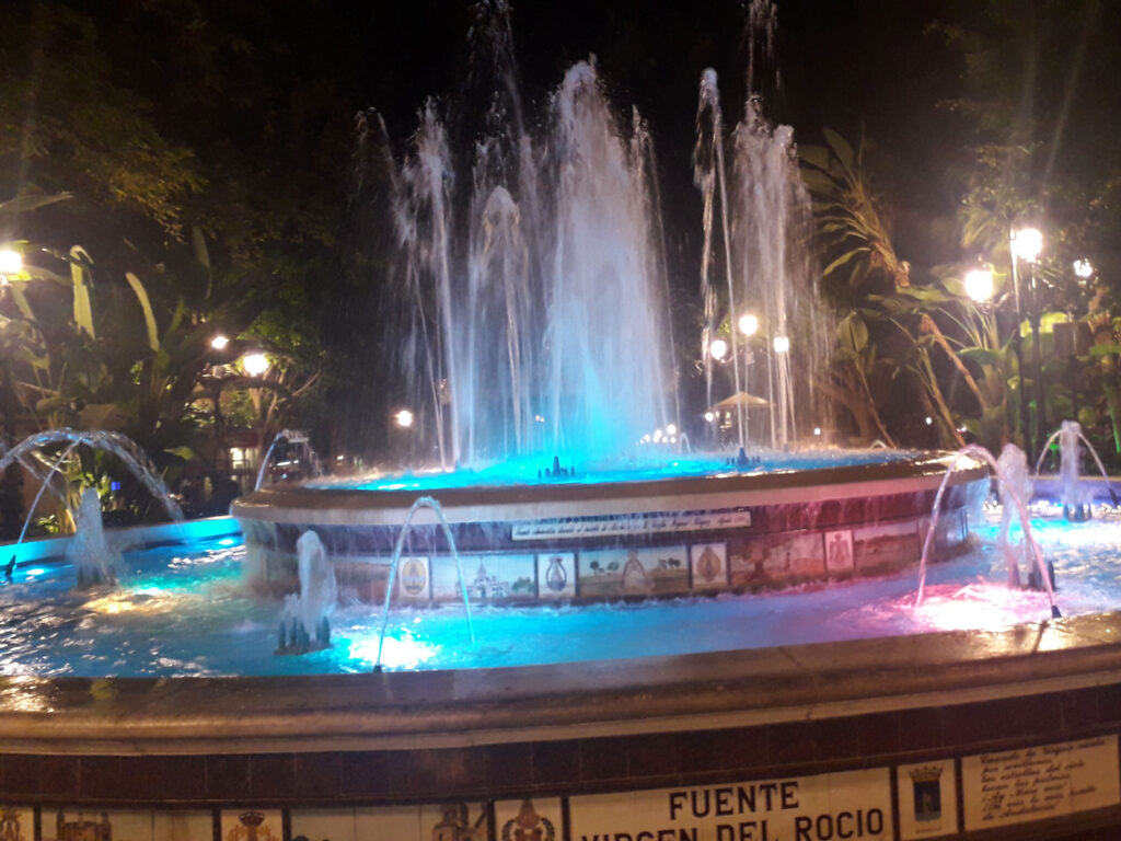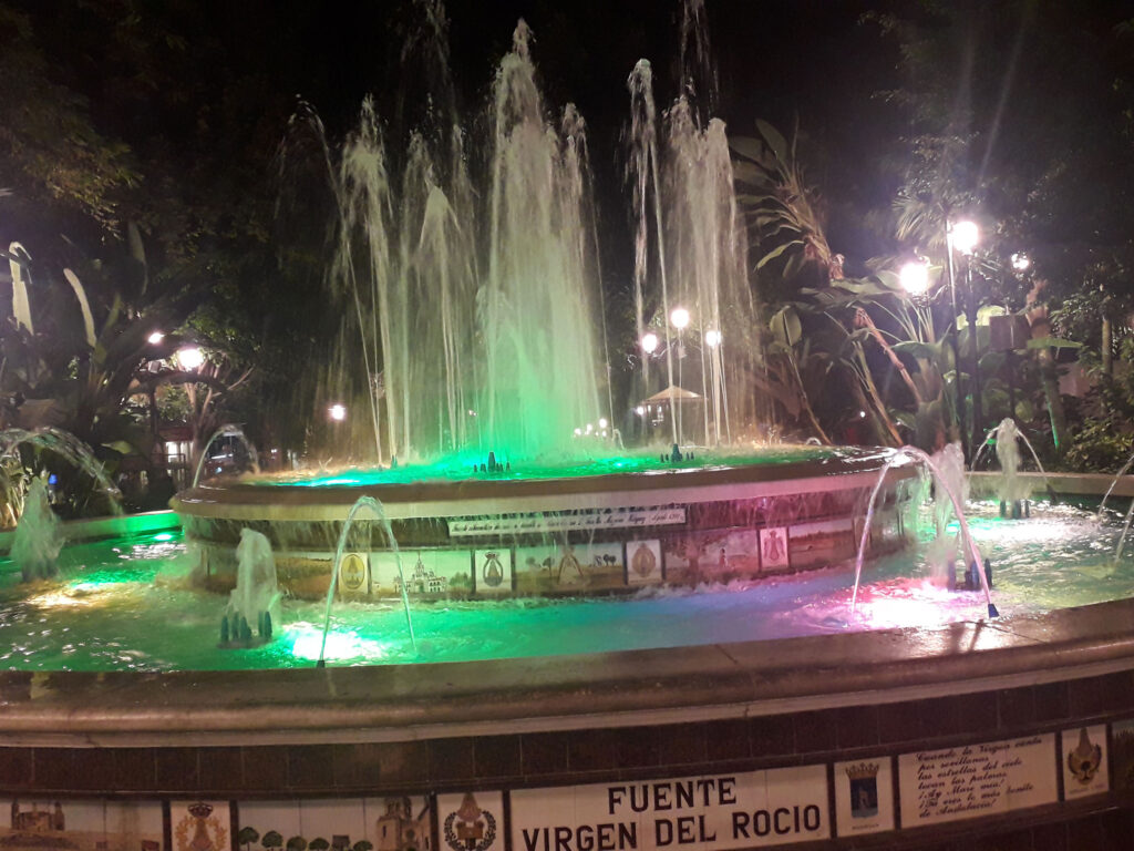 Am Abend wird der Fuente de la Virgen del Rocio mit Licht angestrahlt, dass alle paar Sekunden die Farbe wechselt und eine unvergleichbare Atmosphäre bietet.