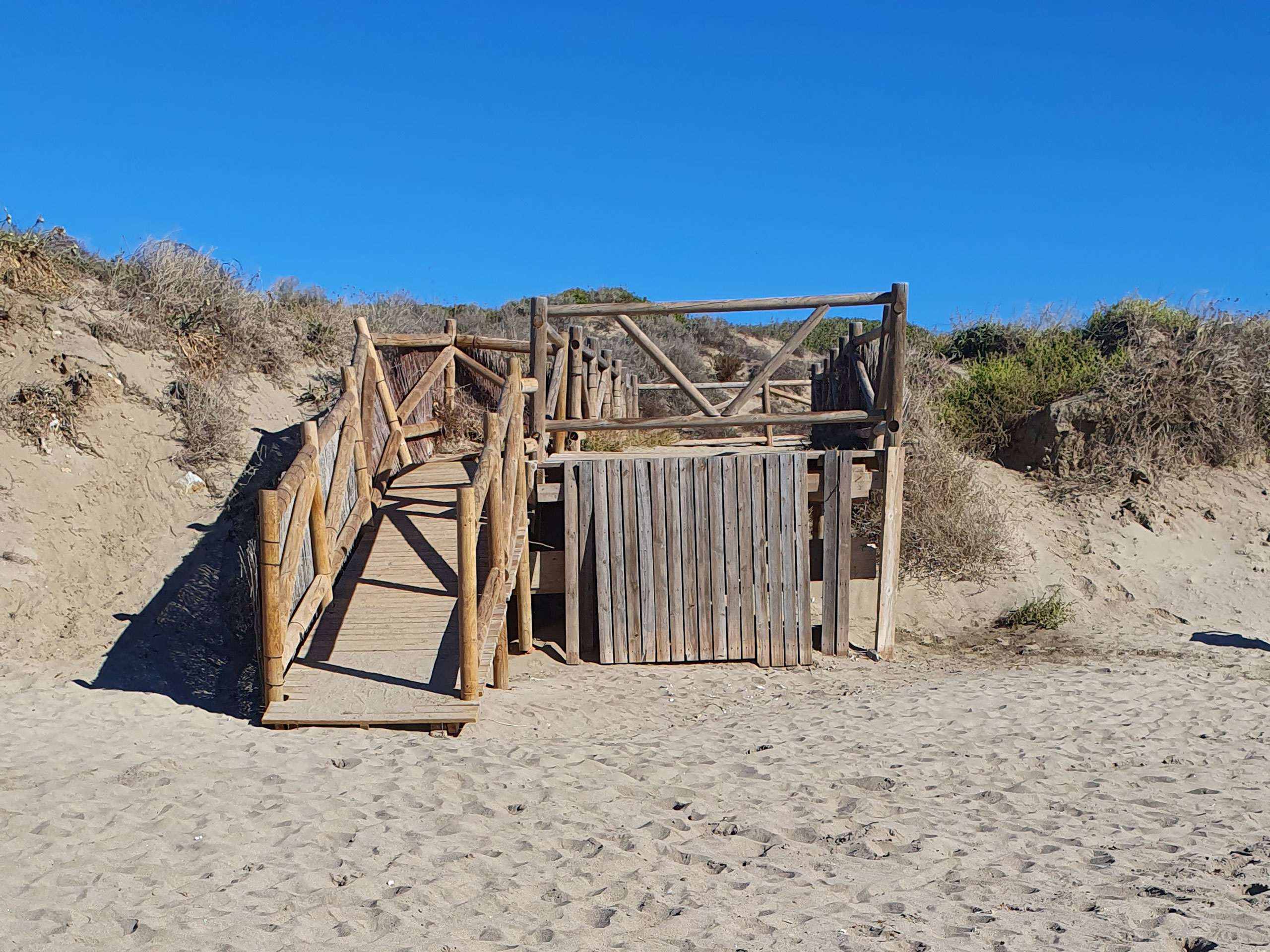 Hier lieber den Strand verlassen und einen kleinen Umweg durch die Siedlung unternehmen und dann wieder den Strand betreten.