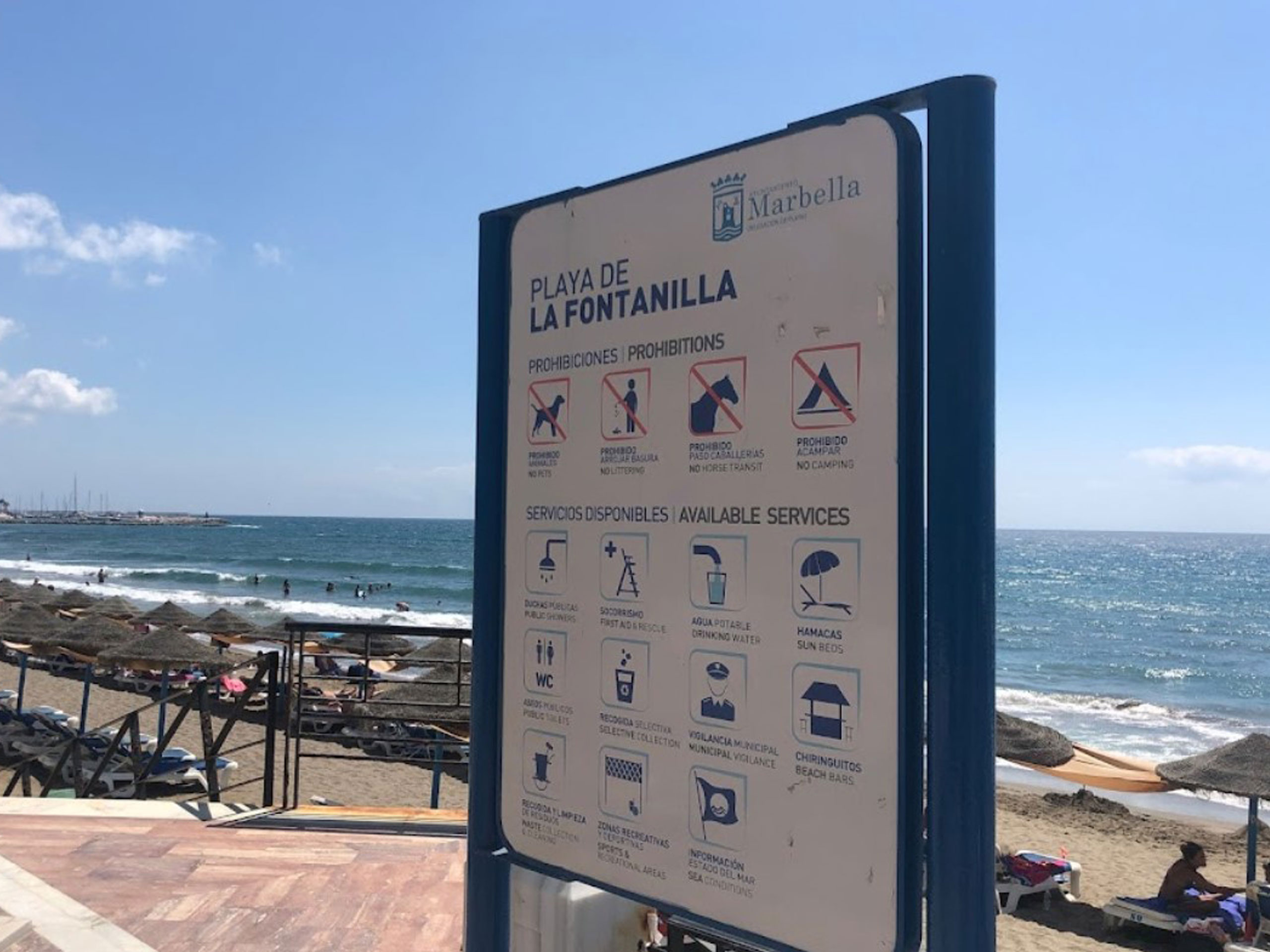 Playa de la Fontanilla wird regelmäßig gereinigt, du findest hier WC’s und Duschen. Seine Auszeichnung mit der blauen Flagge (bandera azul) weist auf die gute Wasserqualität hin.